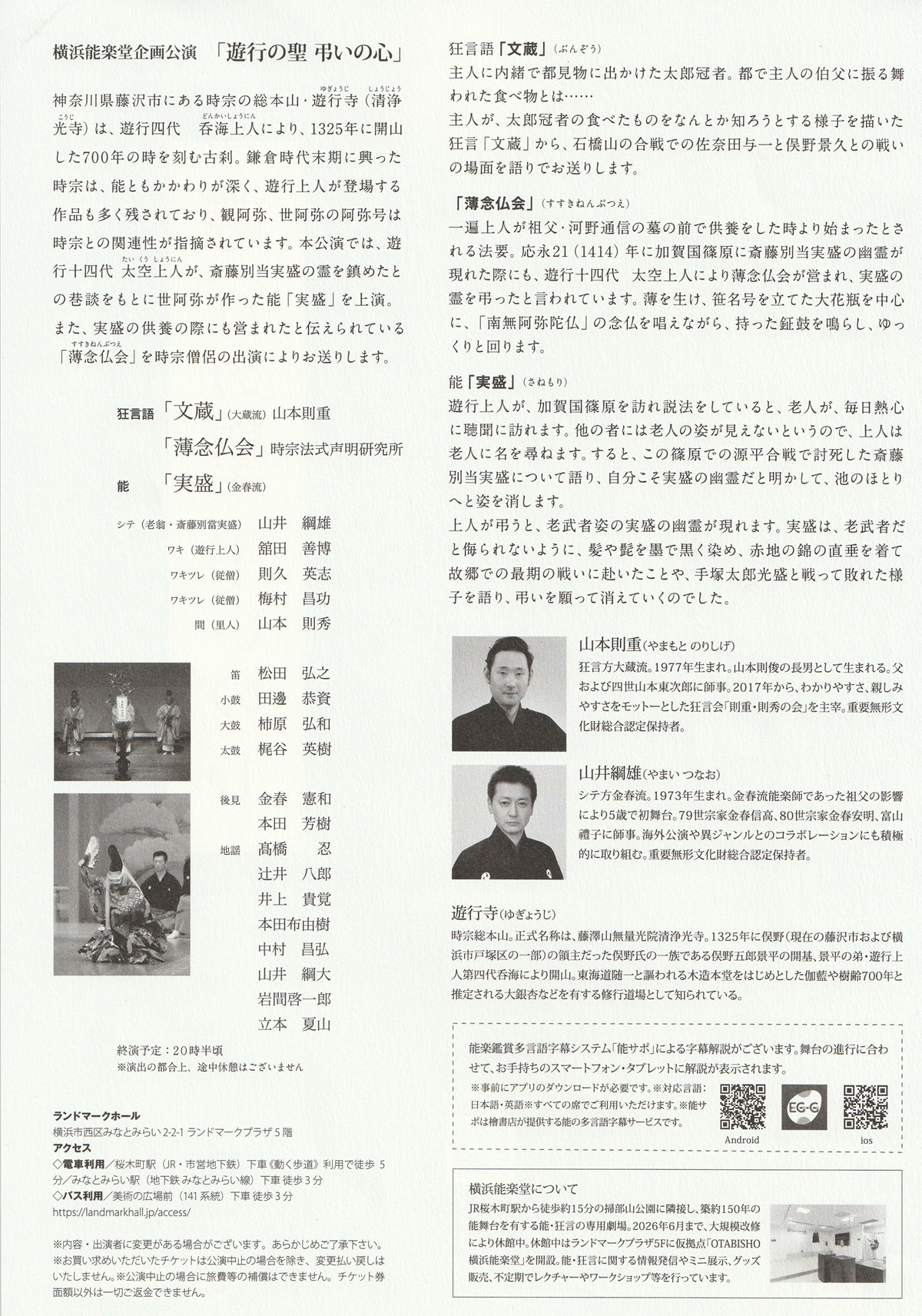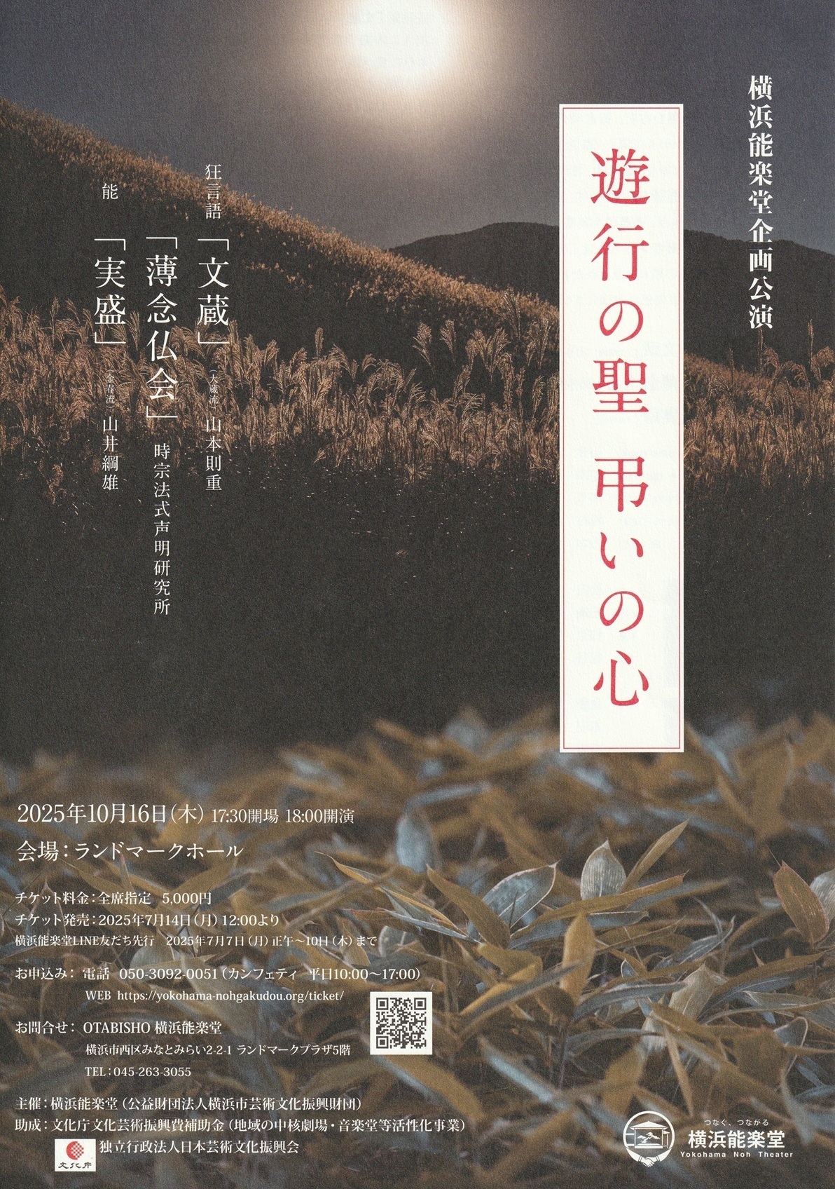 2025年10月16日(木)横浜能楽堂企画公演 「遊行の聖 弔いの心」 17:30開場 18:00~ランドマークホール(横浜市西区みなとみらい2-2-1ランドマークプラザ5階)
