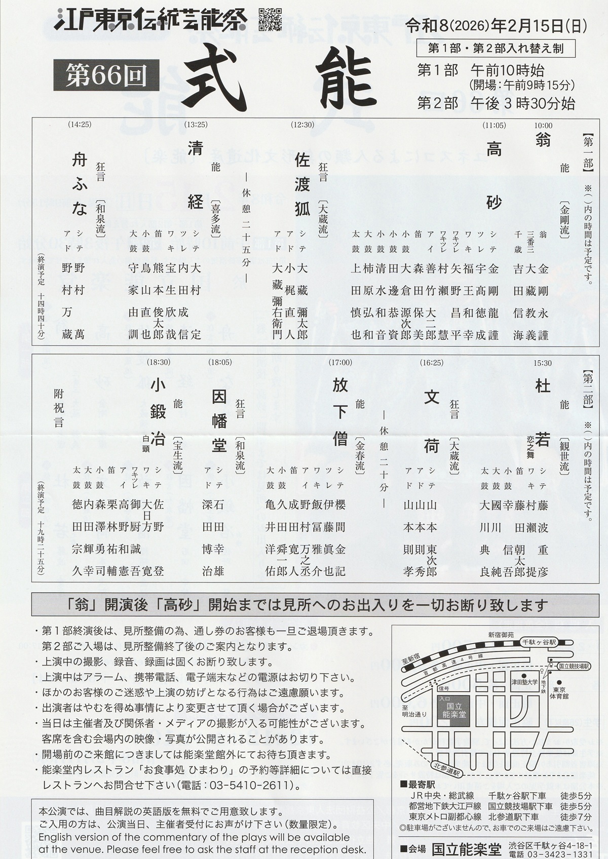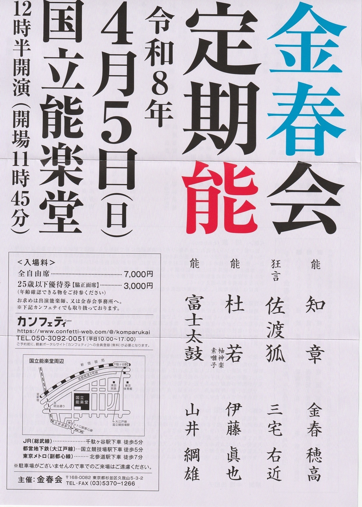 2026年(令和8)金春会定期能 開場11:45 開演12:30~国立能楽堂