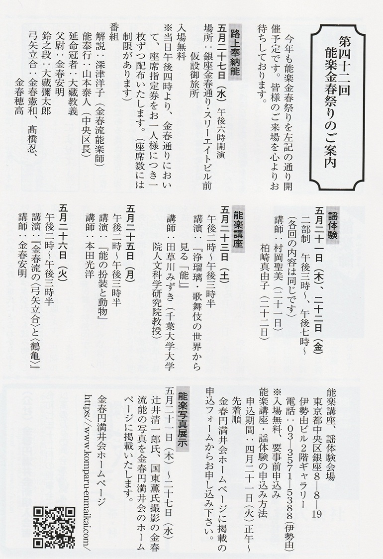 銀座に金春通りがあります。江戸時代、金春家の屋敷が現在の銀座八丁目付近にありました。この屋敷は後に麹町善国寺谷に移りましたが、明治以降、金春の名は、銀座の金春屋敷付近の芸者屋街の名称や、金春湯などにその名を留めています。昭和54年に、この通りの商店で「金春通り会」が結成され、「金春通り」の名が復活しました。能楽金春祭りは、この金春通り会と金春円満井会の協力のもと、昭和60年に始まりました。金春通りでの演能、また、講演、能楽体験講座や能の写真、絵画展などが催されます。金春祭りでは、〈延命冠者、父の尉、鈴の段〉が奉納されます。いずれも、平和を願い泰平を祝福するめでたい曲です。