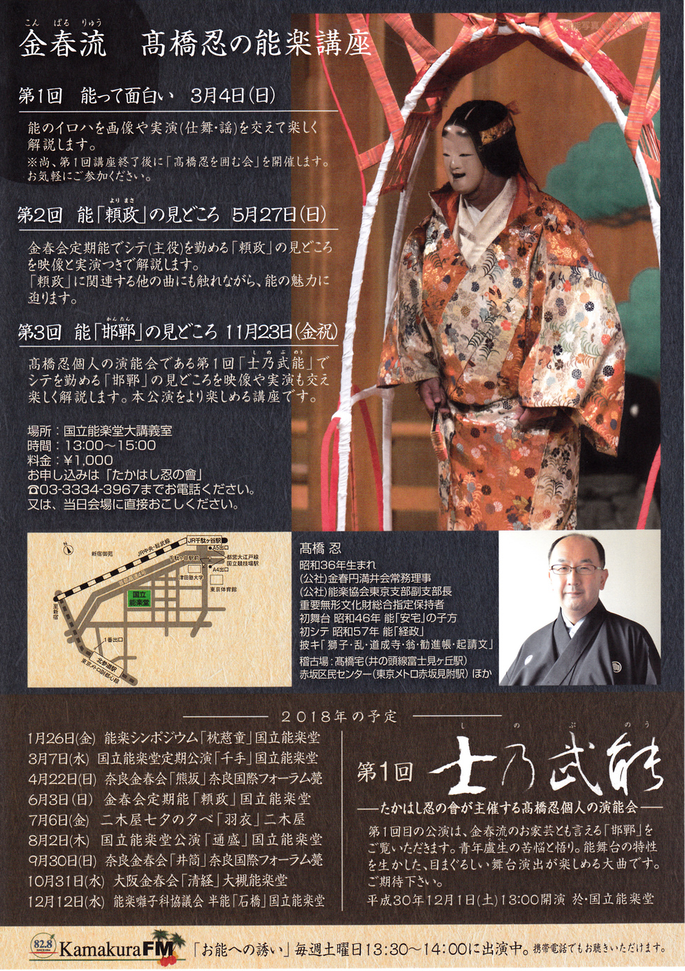 2018年11月23日(金・祝)13:00~15:00「能〈邯鄲(かんたん)〉の見どころ」金春流 髙橋忍の能楽講座 会場は国立能楽堂2階大講義室。