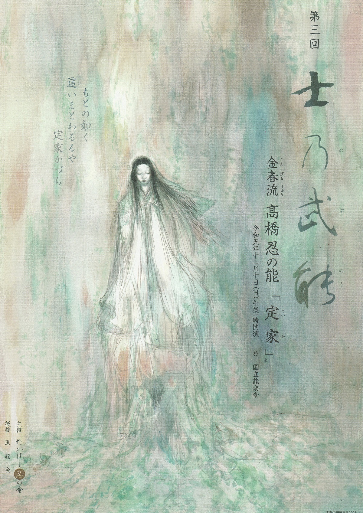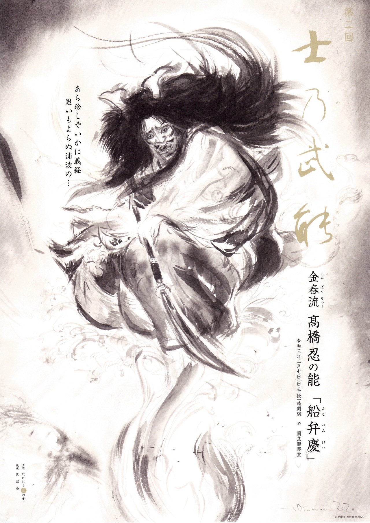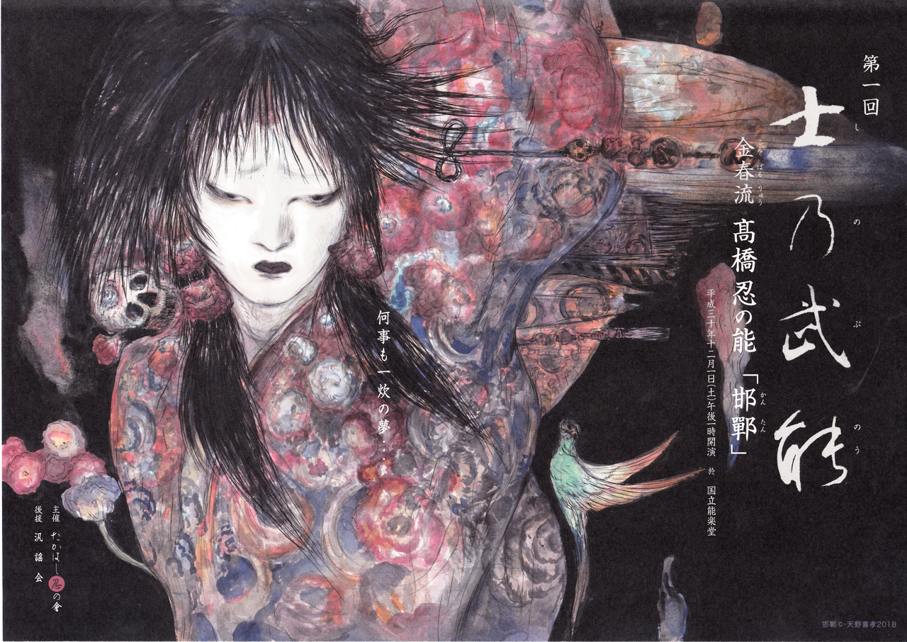 そのパーティにはかつてのタツノコプロ黄金期の方々が勢揃いされ、その中に、天野喜孝(あまのよしたか)先生がおられました。それ以来、私の能に何度も足を運んでいただいておりました。奥様とも懇意にさせていただき、今回、第一回目の私の会のチラシを、意を決してお願いしましたところ、快諾していただき、素晴らしいイラストが完成いたしました。夢のようなお話です。能楽のチラシとは思えない、アートな仕上がりとなりました。素晴らしいイラストに負けないよう、当日まで稽古を重ねて頑張りたいと思っております」